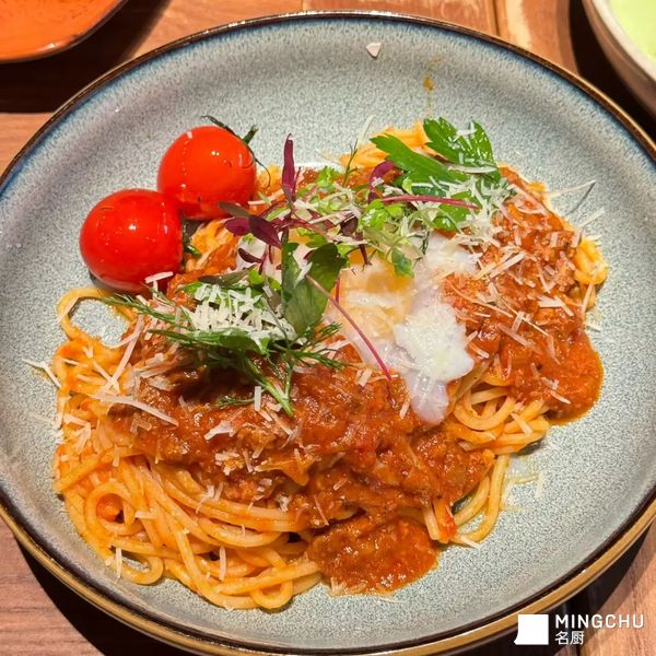 这道温泉蛋番茄意面的灵感,源于“碰撞感”:酸甜浓郁的番茄肉酱裹满意面,是经典意式风味的基底;溏心温泉蛋是点睛之笔——戳破后蛋液裹住面体,柔滑与劲道在舌尖交织,像把“流动的温柔”揉进热烈的烟火气里。点缀小番茄与鲜香草,既提味也让视觉更鲜活,把日常意面吃出“松弛的精致感”。