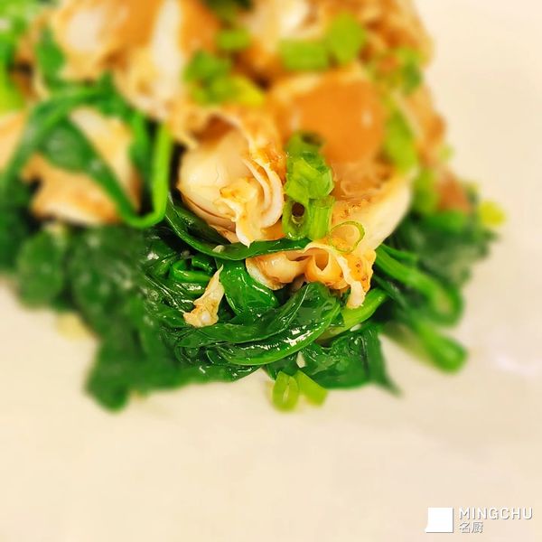 秋天的菠菜苗鲜嫩,红贝正是肥美季节,结合起来鲜嫩无比,更是一道清爽下酒的小海鲜菜品