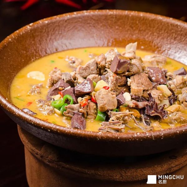 该菜源于九观湖(又名九观桥水库)的民间传说,当地为祭祀降龙形成杀血鸭的传统,后演变为特色美食,制作时多选用肥腻的麻鸭,煸炒出鸭油以保持原汁原味。