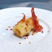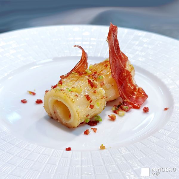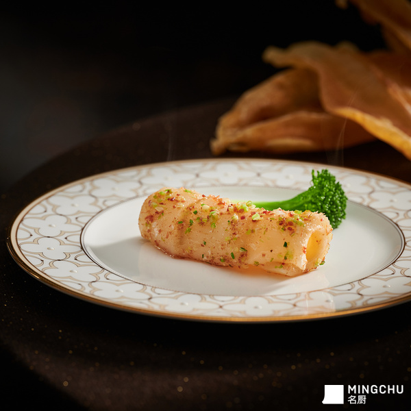 【创作灵感】“古”法新做,够潮州。首创菜品的灵感来源于一道潮州老菜“油泡鲜鱿”,选用的北海花胶胶质丰富,软糯弹牙,原本淡味的花胶,搭配伊比利亚火腿,滋味咸香,再以浓郁葱香味加持,独特美味令人回味无穷。