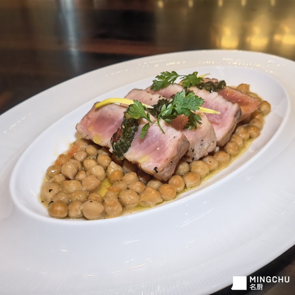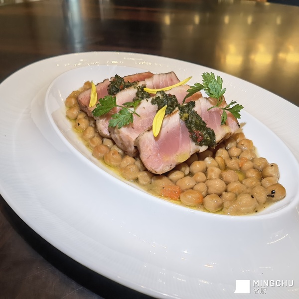 【食材推荐】 黄鳍金枪鱼,鹰嘴豆【创意理念】 源自对地中海与亚洲饮食哲学的深刻理解。黄鳍金枪鱼富含Ω-3和优质蛋白,鹰嘴豆则是植物蛋白与膳食纤维的宝库。二者结合,不仅构建了完美的营养平衡,更形成了海洋与大地、瞬时与永恒的风味对话。【菜品特点】 这道菜将新鲜金枪鱼的鲜美和慢炖鹰嘴豆的醇厚完美结合,口感层次丰富,兼具地中海风情与高级感。金枪鱼外皮焦香,内里柔嫩,鹰嘴豆吸饱了汤汁,绵密入围。无论是家庭聚餐还是招待客人,都是一刀令人印象深刻的料理。