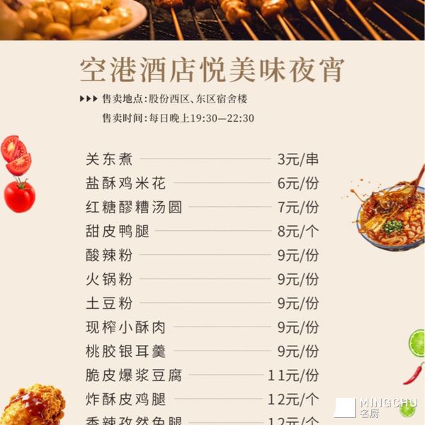 📢【号外号外】🔥成都空港悦享酒店「悦美味」夜宵,寒夜暖味,新旧美味齐登场!❄️关东煮、盐酥鸡米花、红糖醪糟汤圆、桃胶银耳羹等多样美食,一口治愈寒夜,温暖您的每个深夜!而且!以前广受好评的经典食品也照常售卖,不管你爱新奇口味还是钟情老味道,都能在这里找到心头好,满足不同味蕾需求~📍【出摊点位】- 东区:股份东区四期公寓楼旁- 西区:股份西区五期公寓楼拐角处⏰【出摊时间】19:30-22:30,天天在线不打烊!深夜放饥的小伙伴,冲就完事~