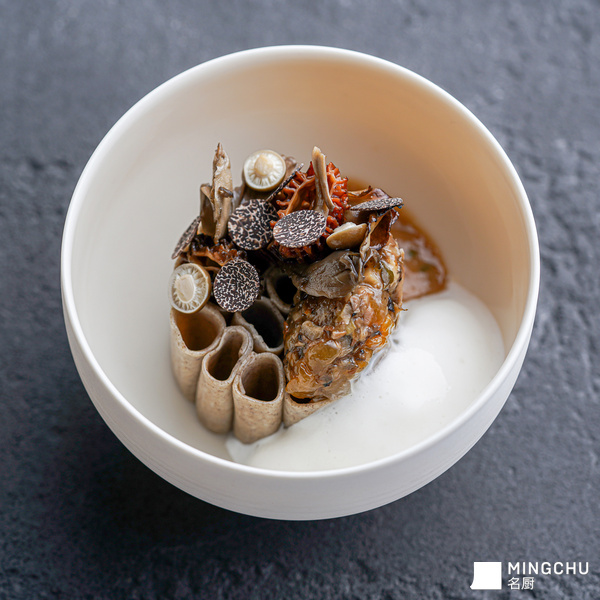 这道主菜是主厨对中国北方传统⻛物的创新演绎,“栲栳栳” 本是⼭西吕梁山区的经典⾯食,因形似 “栲栳”(农家⽤来盛粮食的⽵器)而得名,过去是农户家中的家常主⻝,如今已成为北方饮⻝⽂化独特记忆,主厨取其形、赋其新,让这道乡土美味登上精致餐饮的餐桌。