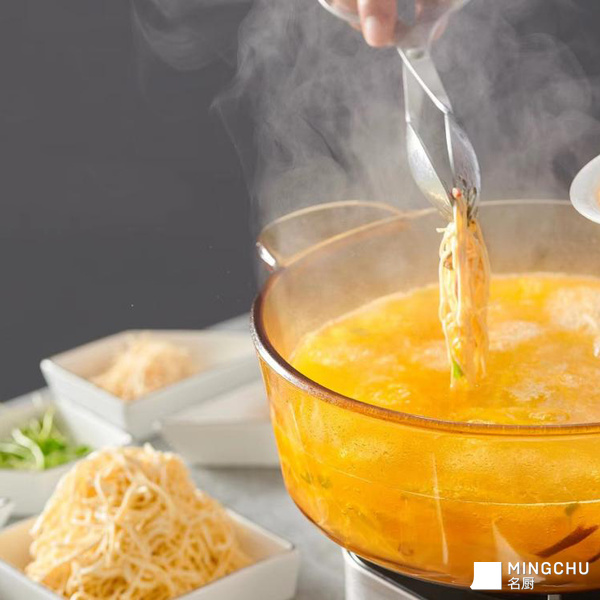 淮扬经典代表菜“大煮干丝”的前身是“乾隆九丝汤”,本菜以此为基础,改良升级而来,刀工要求极为精细,“鸾刀应俎,霍霍霏霏”,一块白干,经加工可片成 18 片,切出的干丝不仅整齐、均匀,而且其粗细不能超过火柴杆,入汤后增色添香。大煮干丝不仅誉满全国,而且被国外来宾誉之为“东亚名肴”。我们加入鱼翅、瑶柱、5J 火腿、鸡丝等八种珍美食材,精心烹制,滋味鲜香,百食不厌。