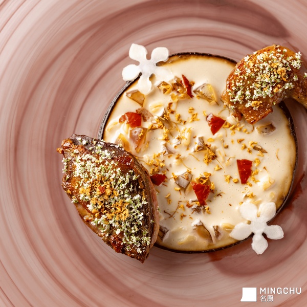以中山石岐乳鸽的熟成香气为核心,将其与广东传统甜品的温润意象重新组合:杏仁奶的柔和、桂花的幽香、红枣的甘甜、桃胶的清润,本是甜品语境里的“温补四件套”,却被引入到咸味世界,形成一种跨界但自然的岭南风味表达。