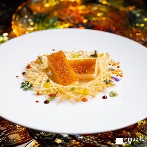 摒弃以常见蒸制手法烹饪百花鸡,采用炸制的方法以去除鸡皮过多的脂肪,香脆鸡皮下的酿虾胶以清甜的日本蓝天使虾、鲜香的越南白虾和爽脆的珠三角花竹虾三种不同虾肉特制。享用前即席刨上经过秘制冻干处理的澳门闻名马友咸鱼,利用百花鸡刚出锅的温度将咸鱼的香味进一步烘托四溢,提鲜增香,而渔网造型的精致摆盘,更同时向老澳门的渔村风貌致敬。