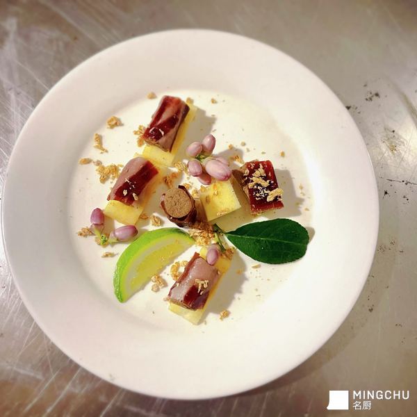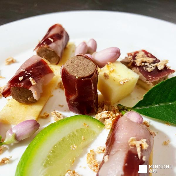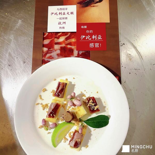 用冬季时节最好的栗子和清酒法国鹅肝的手法佐以青苹果和冰话梅的特殊口味提升伊比利亚火腿的层次感