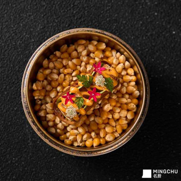 融合山东水果鸡丁而呈现,使用日式鸡肉处理手法,炭火高温烤制,配合山东济宁当地口味。