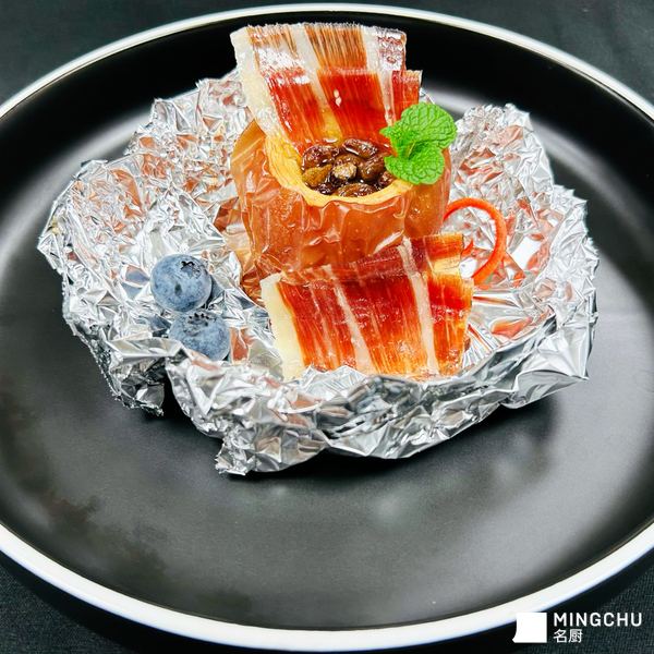 星火轻燎:以喷枪轻扫火腿表层,油脂瞬间焦化,锁住肉质的柔嫩与橡果的醇香,如夜空中的星火点亮味蕾。