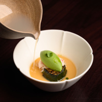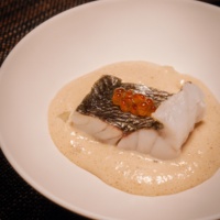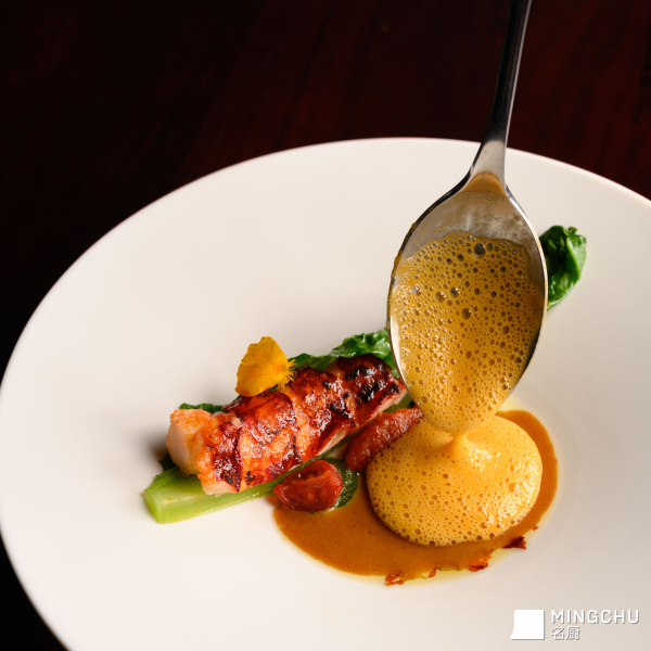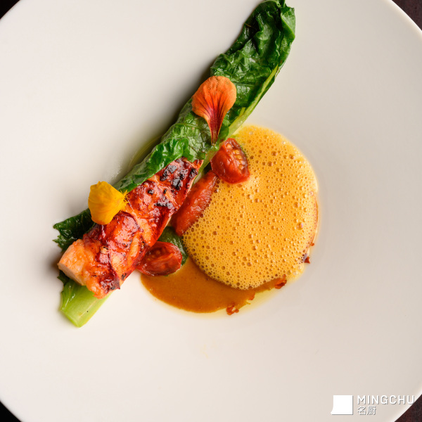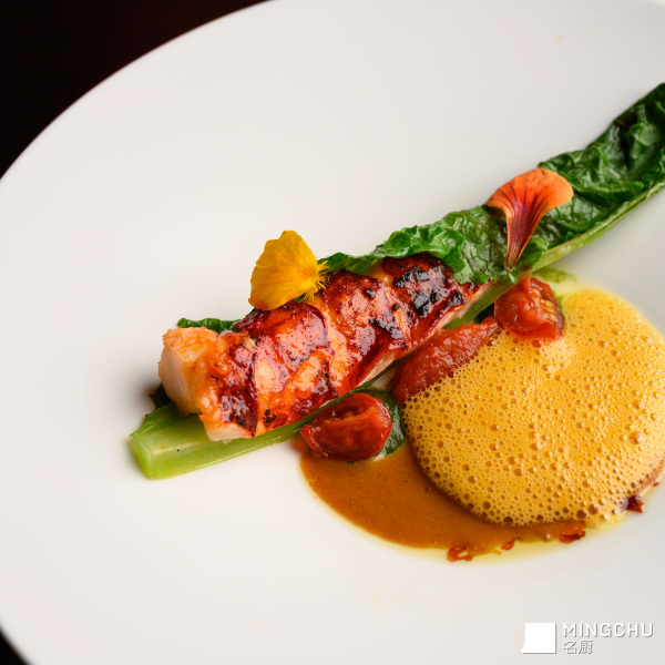 油封番茄油和龙虾油熟成的龙虾,刷上番茄蛋黄酱进行炭烤,旁边搭配芥菜,连接芥菜与龙虾之间的还有部分葱姜蒜炒制的薄壳米;旁边有点缀的南姜、沙姜和藏红花的香料油增加整道菜的香气,(其中还有少许旱金莲花);酱汁部分由干海鲜酱、甜椒莎莎、油封青番茄青酱和半风干番茄;最顶上的泡沫是用番茄水制成。