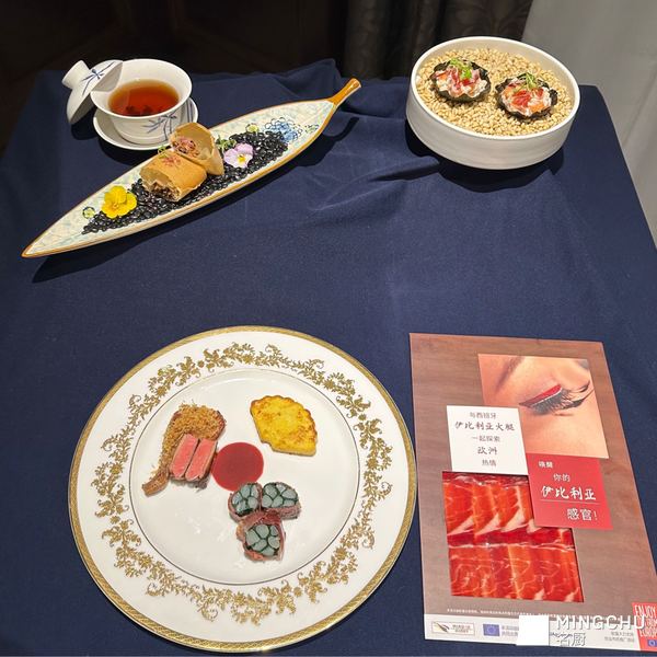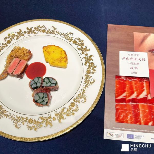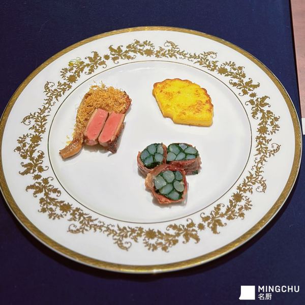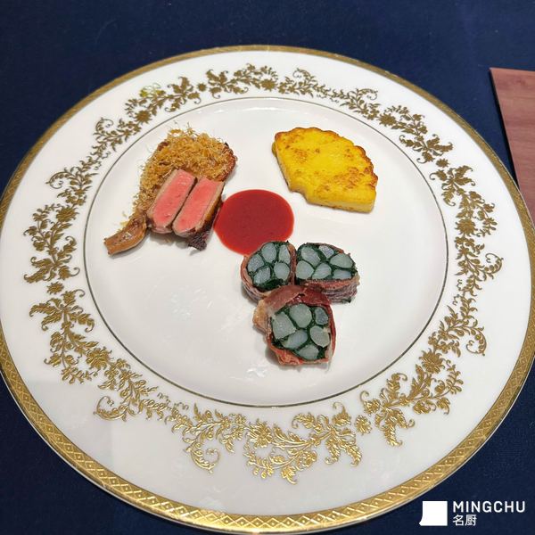 解构传统姜母鸭的味道,用低温慢煮的方式重组这道姜母乳鸽,外表香脆肉质细腻不干柴,虽然改变了烹调方式依然保留着老姜和芝麻油的香味。漳州东山岛盛产白芦笋,用菠菜叶卷起依次堆叠再以伊比利亚火腿覆盖成大理石卷,玉米粑粑是小时候的午后小点,自然的玉米甜味,面粉的香气,外表煎至金黄,号称中式的松饼。姜汁梅果酱的灵感来自福建家乡的甘草水果,在福建或是潮汕地区一般都会撒上干燥过的南姜末,是小时候觉得特别奇怪的感觉,也是长大后所怀念的味道。 #伊比利亚火腿 #第125期试用