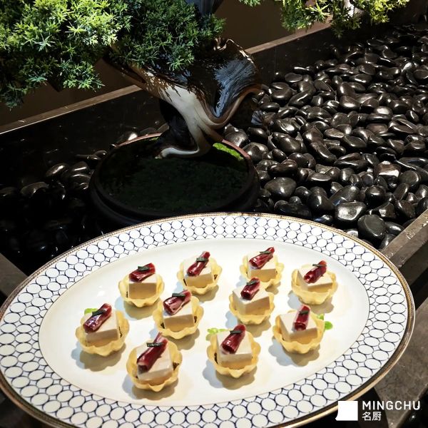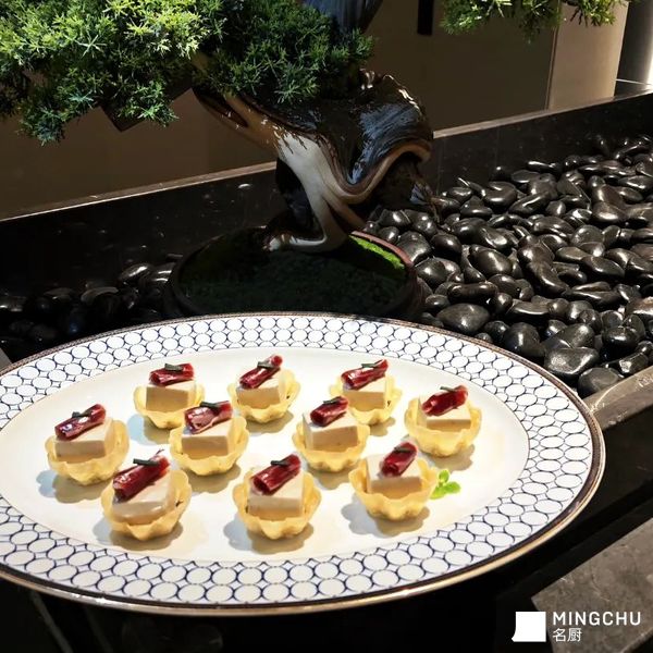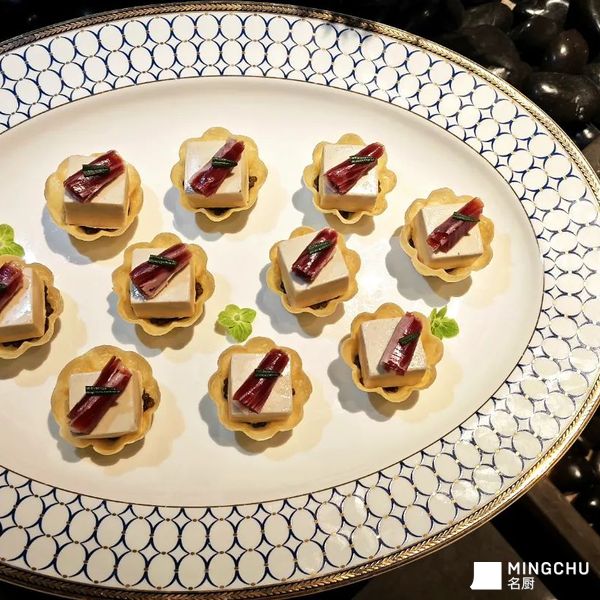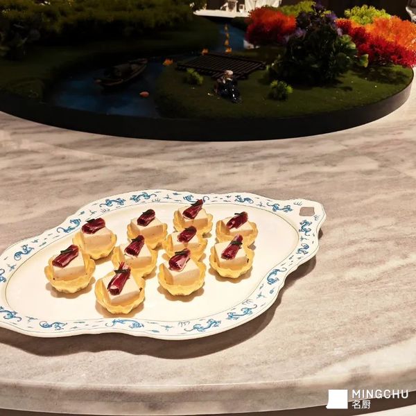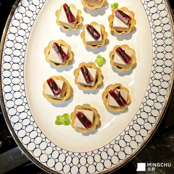 创意灵感:解构燕麦与火腿的常见搭配,以酥脆燕麦塔为基底,填入15年鱼子酱和慢烘酥脆松子与口蘑制成的慕斯,顶部搭配火腿薄片,呈现鲜甜咸香、脆滑的对比实现了热到冷的华丽转身。