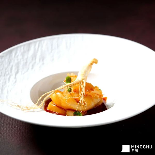 承古方之精髓,融珍味于一盅八珍糕烧花胶,是一道融合明代养生智慧与当代烹饪美学的匠心佳肴。它以《外科正宗》八珍古方为本,选取人参、山药、莲子、茯苓、薏苡仁、芡实、白扁豆、杏仁八味药食同源食材,精磨成粉,制成温养脾胃的八珍糕;再配以胶质丰润、滋养护肤的花胶,以慢火细烹,使古方精华与海味醇厚相互渗透。烹制时人参预先与浓汤同蒸,取其甘润补气之底蕴;花胶柔滑入味后,与八珍糕共煨于人参汤中。小火慢烧之间,糕体软糯,汤汁收浓,最终成就一盅食养兼具的温补美馔。