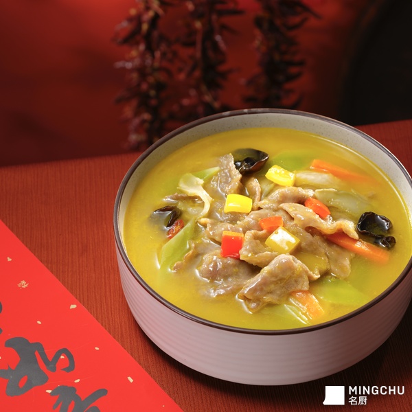 【创意来源】我们在传统酸汤牛肉的基础上寻求突破,借鉴温州“敲虾”的工艺灵感,将牛肉手工处理成薄而匀的片状,使其质地紧密、更易吸附汤汁。引入虹吸壶进行萃取与融合,通过精确控制温度与压力,萃取出香料的完整层次,并让汤底的酸、辣、鲜得以完美交融,创造出清澈透亮却风味高度浓缩的黄金酸汤。【风味特点】这道菜以独家调制的味达美酸汤酱为风味基底,严格遵循黄金开汤比例,并佐以白糖与味达美醇香米醋点睛,形成了酸爽明亮、辣而不燥、鲜香绵长的复合滋味。
