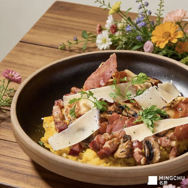 这款烩饭的创作,以秋日风物为核心脉络,将意式烩饭的经典技法与秋季食材的丰饶质感相融。灵感源于意大利北部秋日的田园图景:南瓜成熟的甜糯、野菌破土的鲜香,与风干火腿的咸醇形成秋日味觉三角。