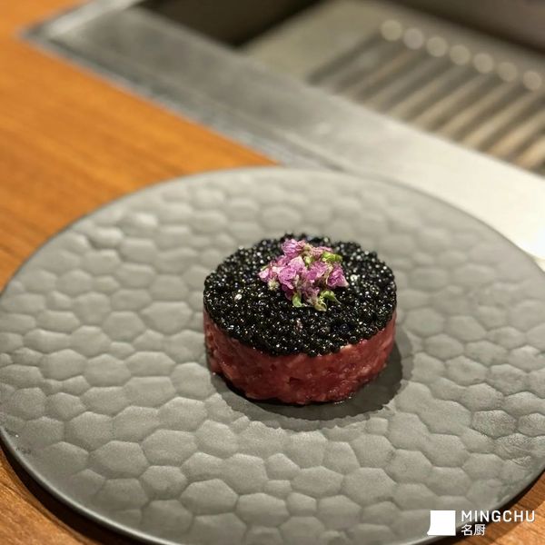 这道鲟鱼子牛肉塔塔的创意,源于东西方食材的碰撞与质感的对比融合。以和牛塔塔为基底,取其柔嫩绵密的肉质口感,搭配鲟鱼子的爆破式咸鲜,形成软嫩与弹脆的味觉反差。主厨借鉴法式塔塔的经典做法,又融入日料的精致摆盘逻辑,用模具塑造规整的圆柱形态,让红嫩的牛肉与墨黑的鱼子形成视觉冲击。顶部点缀食用花,既平衡了厚重的咸鲜,又添一抹自然清新,是对高端食材本味的尊重,也是对现代融合料理“形味共生”的诠释。