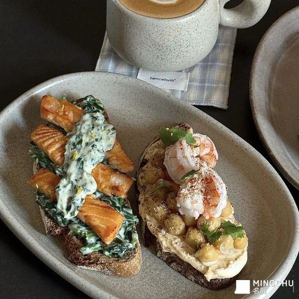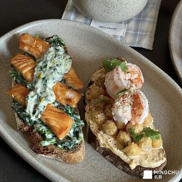 Brunch的快乐是开放三明治给的!菠菜芝士裹着肥美的三文鱼,咸香在嘴里化开;大虾鹰嘴豆的组合又多了份绵密的豆香,一口咬下,是舌尖的小确幸呀~