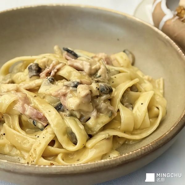 这道菜的核心创意在于将西式经典元素进行融合与升级。它在传统奶油意面的基础上,通过添加培根和蘑菇,增加了风味的层次感和口感的丰富度。