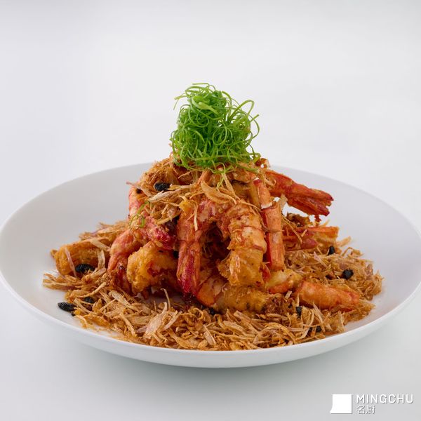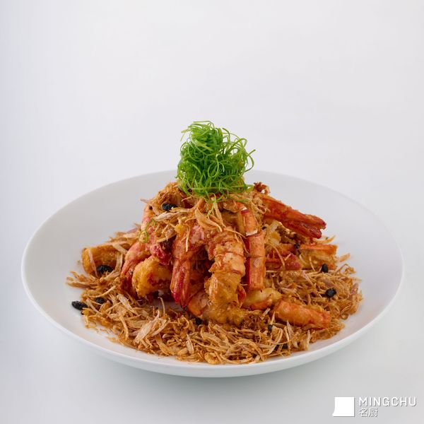 改好花刀的竹节虾,披上用澄面、面粉和生粉调制的轻薄脆衣,与红葱头一同滑入滚烫的油锅。极其考验厨师功力的一刻就此展开:需在同一油温下,让红葱头慢慢逼出深沉甜香,同时让虾身上的脆衣精准定型,形成酥脆金甲。