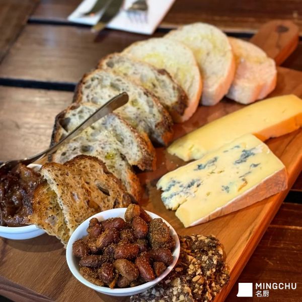 它以多款不同风味的奶酪(图中有蓝纹奶酪、硬质干酪等)为核心,搭配现烤的欧式面包(如法棍、杂粮欧包)、坚果、果酱/蜜饯等食材组合而成,通过奶酪的咸香、面包的麦香、坚果的香脆和果酱的酸甜形成味觉层次,是西餐中极具仪式感的经典搭配。