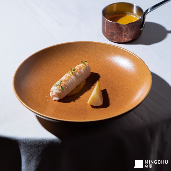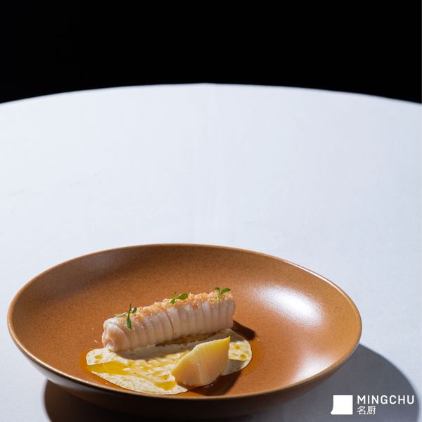 冬笋、金桔酱、沙棘油、鱼高汤、鳐鱼干