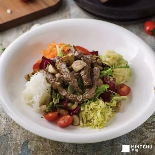 这道菜将西式碳烤与中式食材搭配理念相结合。它打破了传统沙拉以冷食为主的形式,加入了热的碳烤牛肉。这样既能享受沙拉的清爽,又能满足对肉类的需求。