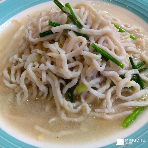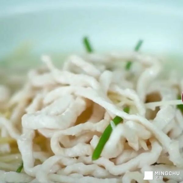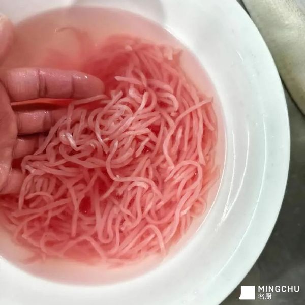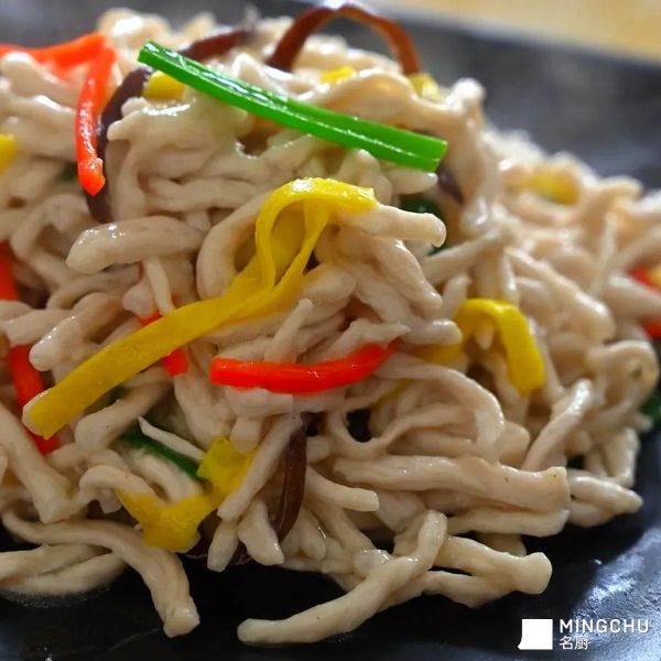 里脊去筋膜,平铺,用刀背细细捶一遍。“不是砸,是抚。把肌肉纤维抚松了,吃起来才嫩。”然后逆纹切成薄片,再顺纹切成丝。刀起刀落,几乎没有声音,肉在刀下驯服地分开,每一根都均匀细长,在案板上堆成一座粉白的小山。