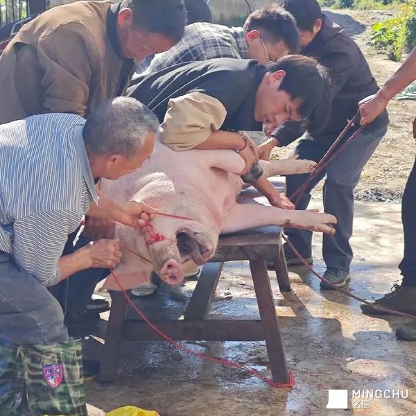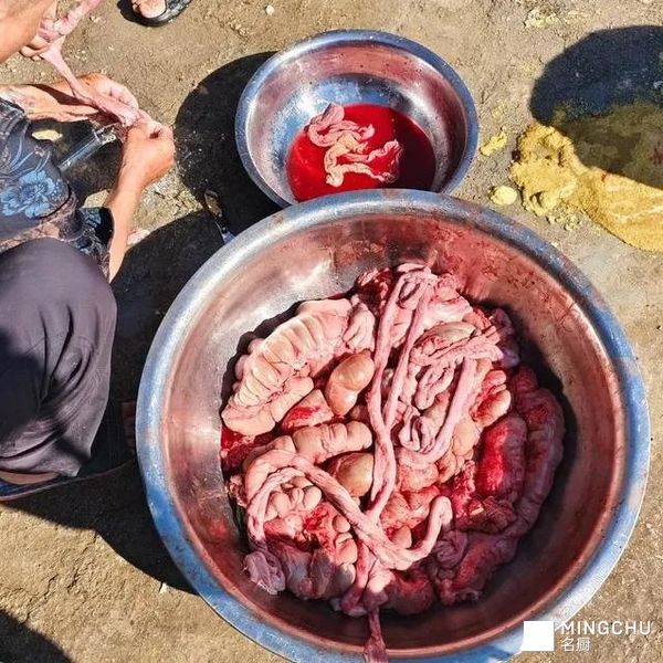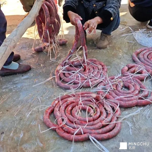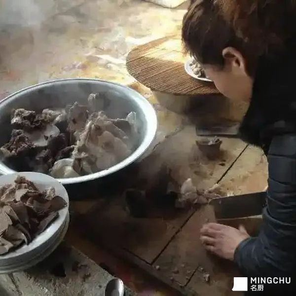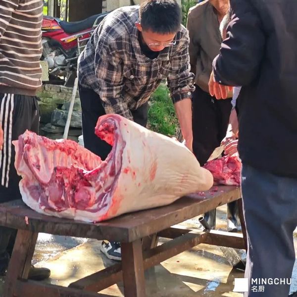 莱肴”的老师傅,是这场江湖里的定盘星。他眯着眼,不紧不慢地侍弄着那副猪头,镊子精准地夹走最后的绒毛。旁边帮忙的汉子,把新鲜猪蹄剁得“哐哐”响,火星四溅;女人们围着一大盆还温乎的猪血,兑盐水、搅方向,手脚麻利得像在变戏法。孩子们在人群腿缝里钻来钻去,眼睛只盯着锅里渐渐变成金黄的油渣。“出锅喽!”一声吆喝,一笊篱酥脆喷香的油渣撒上盐花递过来,烫得小手直倒腾,塞进嘴里“咔嚓”一声,满嘴流油——这是这场盛宴发给所有小孩的、最原始的快乐门票。