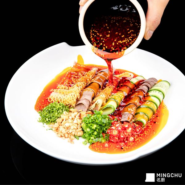 以经典夫妻肺片为灵感,融合现代餐饮美学与传统技艺,精选牛舌、牛腱、金钱肚等核心食材,经老汤卤制后切片,搭配青瓜卷、花生碎等层次辅料,淋入汉源花椒与二荆条秘制红油,呈现辣而不燥、麻香悠长的平衡口感。菜品以“分层码盘+现场淋油”的仪式感呈现,兼具视觉冲击力与风味深度,适配各种宴请的精致需求。