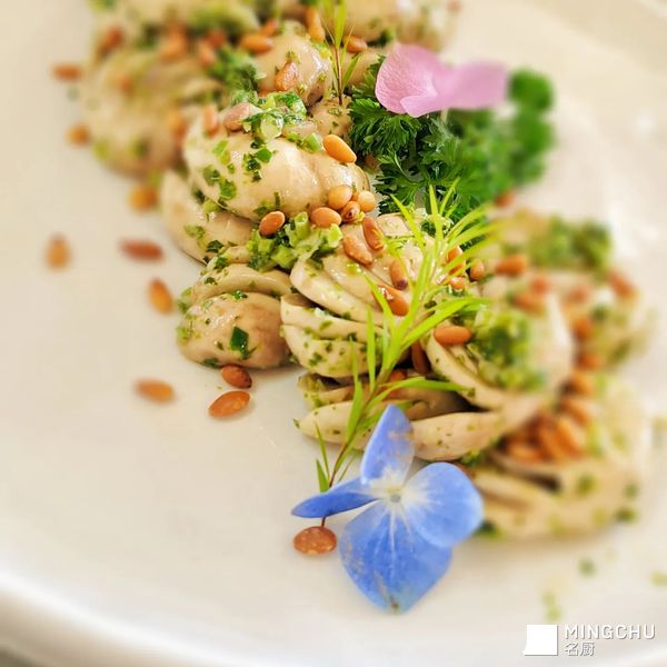 入口最先冲击味蕾的很可能是香椿酱鲜明馥郁的春日气息,紧接着黑虎掌菌狂野的山林菇香会加入进来,两者交织,底层则由松子的烘烤焦香和口蘑的奶油坚果香提供温暖的基调。 口感碰撞:口蘑的肥厚爽滑与黑虎掌菌的扎实脆韧形成有趣的对比,而香椿酱的油润和松子的颗粒感则包裹着菌菇,让整体口感更顺滑丰富。这道菜融合了野、香、醇、润,是一场从山林到餐桌的风味冒险。