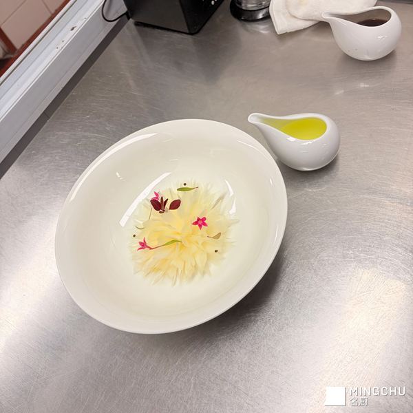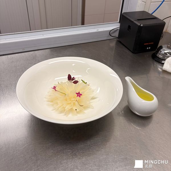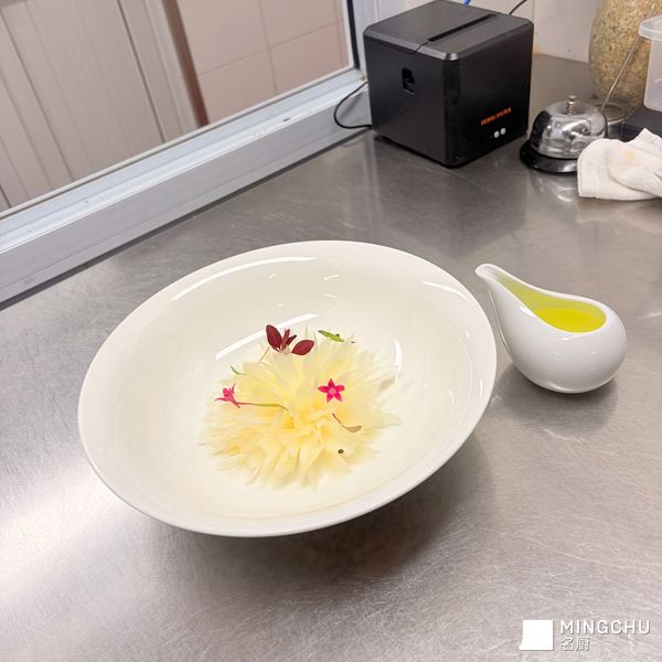 【创意理念】以白芦笋的清甜脆嫩为核心,借鉴岭南“花型刀工”技法,将其片成层叠的花瓣状,呈现出绽放的视觉美感。搭配经典的柠檬油醋汁,酸鲜的风味与芦笋的温润清甜形成平衡,兼具清爽口感与雅致摆盘的轻食菜品。【菜品特点】• 花型刀工:芦笋片成薄瓣层层叠放,形态如凝脂白花,视觉轻盈雅致。• 酸鲜平衡:柠檬油醋汁的清爽酸香,中和芦笋的温润,提升整体风味层次。• 轻食质感:低脂健康,摆盘精致,适合作为开胃前菜或搭配主菜的清爽