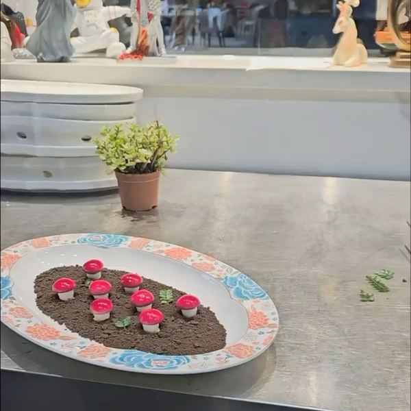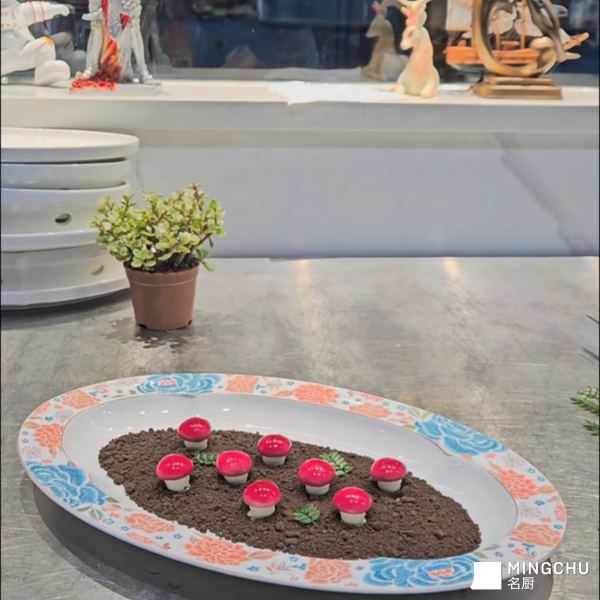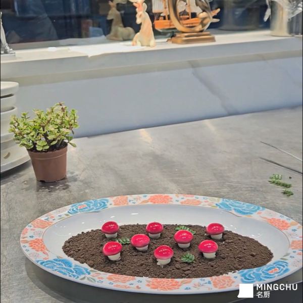 造型吸睛:鹅肝被塑造成红顶白柄的蘑菇形态,鲜艳的红色表皮与松露黑土形成强烈视觉对比,宛如从土壤中自然生长而出,兼具艺术性与趣味性。