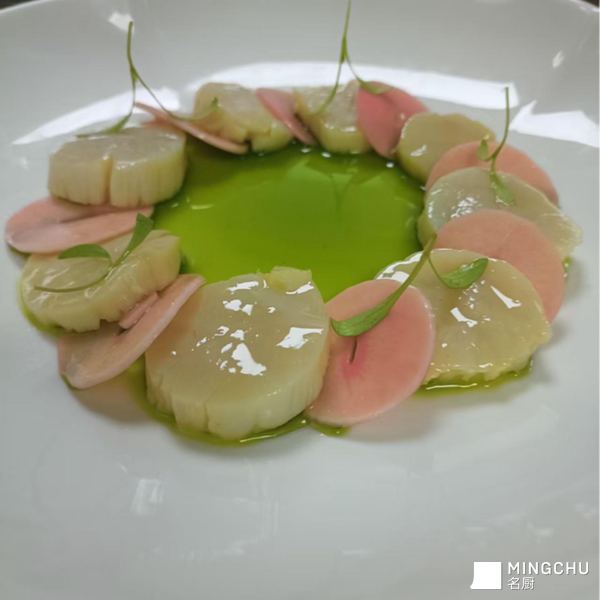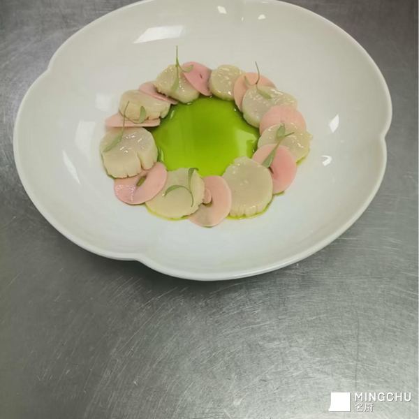 选用山东地理性标志产品金乡独头蒜特点脆嫩微辣,搭配鲜活扇贝,特点酸辣开胃,是一道很有特点的前菜