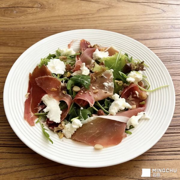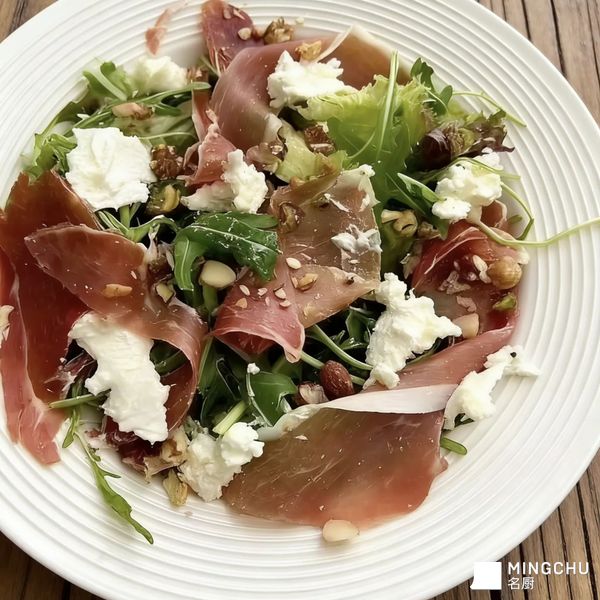新鲜芝麻菜:叶片脆嫩,自带微微的辛辣与青草香气,清爽解腻,是沙拉的经典基底。 山羊奶酪:质地绵密柔软,奶香浓郁且略带微酸,能平衡火腿的咸香,提升整体风味层次。