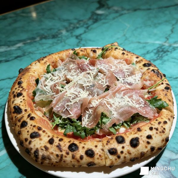 帕尔玛火腿:选用意大利帕尔玛产区的风干火腿,肉质紧实咸香,带有坚果与陈年奶酪的复合香气,脂肪分布均匀且口感温润不腻。窑炉饼底:以高筋面粉搭配天然酵母低温发酵,饼底边缘烤至金黄焦脆,中心松软有嚼劲,麦香浓郁。 配套食材:搭配新鲜芝麻菜与帕玛森干酪碎,微苦的菜叶与咸鲜的火腿形成平衡,干酪的醇厚进一步提升整体风味层次。
