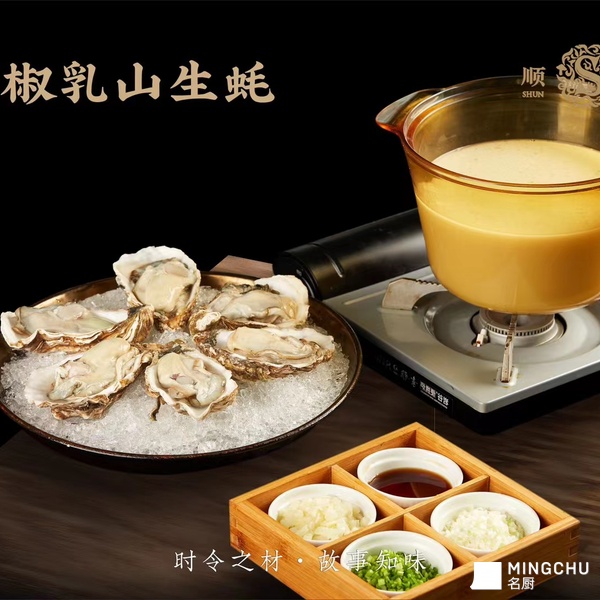 选用乳山生蚝,搭配主厨秘制醋椒汤汁,席前煮制生蚝口感丰富,入口有一股淡淡的海水味,咀嚼之后随之而来有一股强烈的海藻香味,一口蚝肉一口汤,能激发您的味蕾!