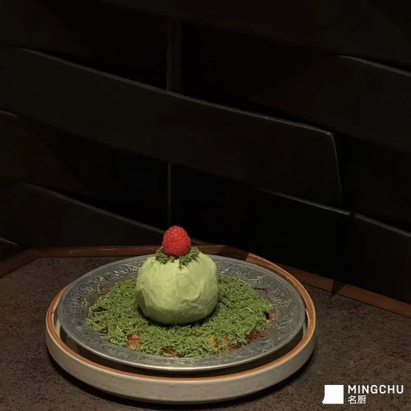 绿色的抹茶与红色的树莓形成鲜明色彩对比,既呼应了东方美学,又让整道甜品在视觉上更具吸引力。