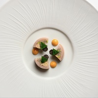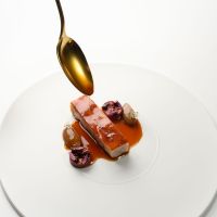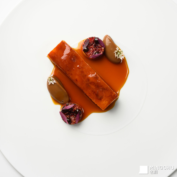 酱汁是菜品风味的点睛之笔,以潮汕十年老香黄制成法式Gastrique酱,陈香甘醇中透出酸爽,巧妙平衡乳猪的丰腴。配菜选用秋冬时令甜菜头,以烤制、酱汁与腌渍三种形态呈现,最后淋上以乳猪原材慢炖浓缩的传统法汁(jus),将全部风味融汇升华。