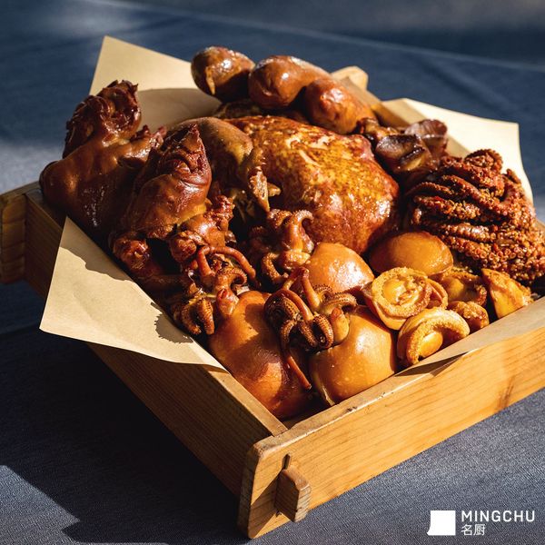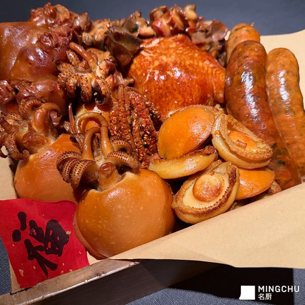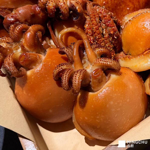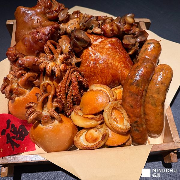 “一炉熏香,海陆同鲜。” 拼盘端上桌,色泽油亮,熏香味浓,我想要呈现过年时红火的寓意与北方人盛情豪放的氛围。灵感来自传统的东北熏酱,在我们北方,这是世代相传、每家每户都会吃的过年家宴菜,象征团圆丰足。我在此基础上,创新加入小鸡蘑菇肠和渤海湾的海鲜,以肉类与海鲜制作拼盘,传承经典,展现技艺的同时,结合辽河口渔家菜的特色饮食文化,增添新意,丰富口味。