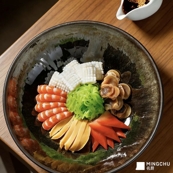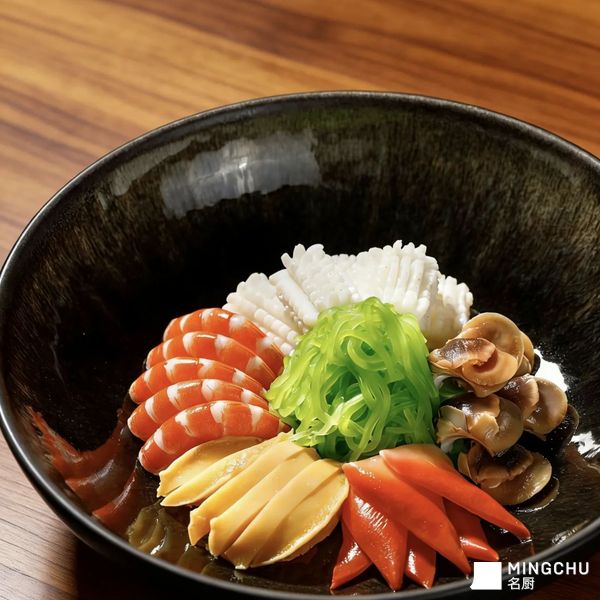 2. 搭配辅料:选用脆嫩爽口的深海裙带菜、色泽鲜亮的甜红椒,无多余杂料,以极简搭配凸显海鲜本味。