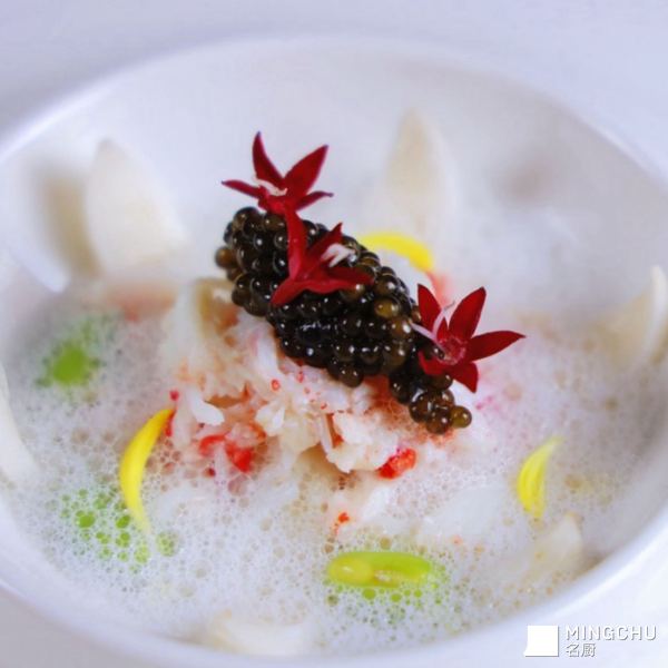 海与大地的本味对话,用最克制的方式,还原食材最干净的味道。松叶蟹蒸8分钟,取肉、留黄、留壳。蟹膏与蟹壳慢火熬煮,收至极少百分之2的原汁,只提取蟹本味,再融入奶油,打成轻柔绵密的泡沫。不额外加盐、不刻意调味,只用蟹自身的鲜咸来平衡整道菜的风味。兰州九年百合削成橄榄形,仅过冰水锁脆,保留原生的清甜与爽脆口感,用大地的甜去呼应海鲜的润。搭配春日鲜毛豆,添加清新脆嫩感,让整道菜多一分春季氛围.