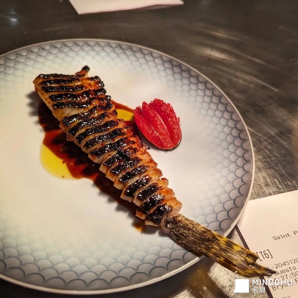 海鲈鱼经过高温炭烤,鱼皮焦香酥脆,鱼肉却依然保持着细腻的质感。搭配的柑橘鱼子酱以其明亮的酸度,平衡了鱼肉的油脂感,而盘边的酱汁则用鱼露和橄榄油调制,为整道菜注入了地中海的阳光气息。