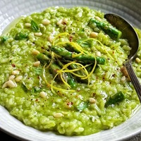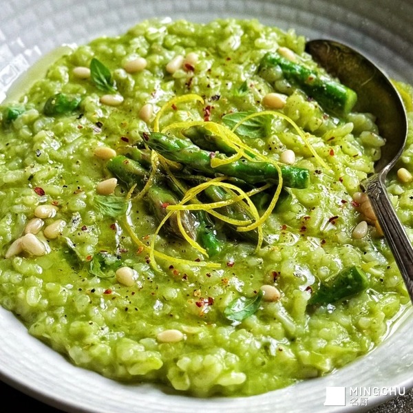 5.直到短粒米熟到自己喜欢的程度,加入芦笋和柠檬皮细丝,翻炒片刻。再依次加入芦笋糊、纯素芝士,翻拌均匀。