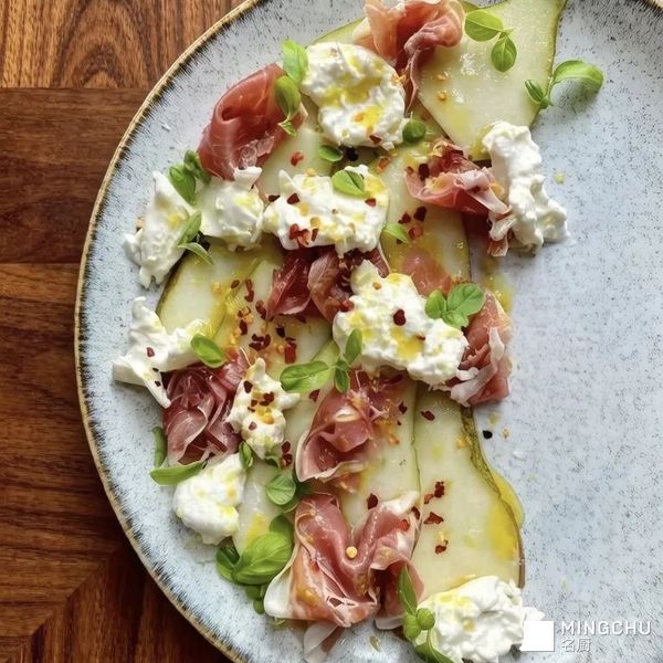 菜品外观精致简约,红润的火腿薄片与莹白的布拉塔芝士形成鲜明对比,点缀的绿色蔬菜平衡了色彩。口感对比强烈,火腿提供扎实的嚼劲与咸鲜,芝士则带来爆浆般的绵密与清爽奶香,风味平衡,余味悠长。