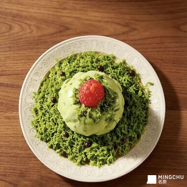 绿色的抹茶与红色的树莓形成鲜明色彩对比,既呼应了东方美学,又让整道甜品在视觉上更具吸引力。