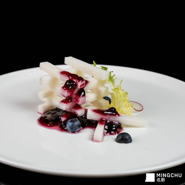 烹饪工艺:山药仅以沸水轻焯30秒,锁住脆嫩本味;蓝莓熬制成果香浓郁的酸甜酱汁。