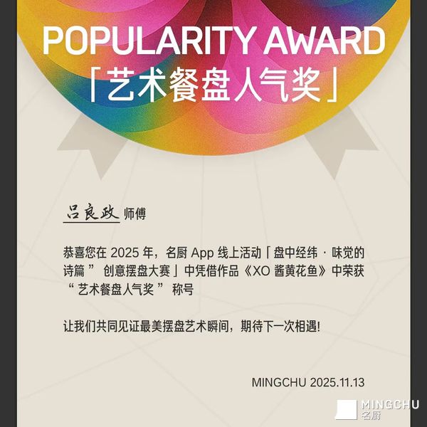 非常感谢名厨平台给予展现自己的机会 。相信自己,越来越好。继续加油!