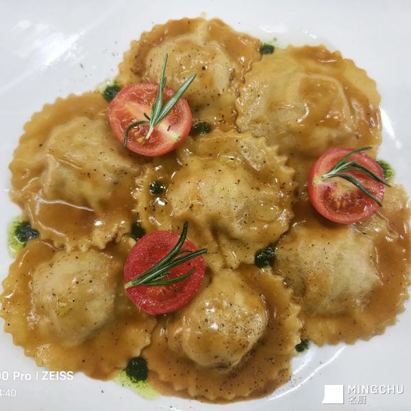 · 风味醇厚:牛肉与西芹、胡萝卜的意式蔬菜 soffritto 底味很足,搭配布朗少司(牛肉酱汁),肉香浓郁立体。· 质地反差:芝士的绵密与少司的丝滑包裹牛肉粒,口感饱满。· 潜在问题:传统意式饺子以黄油鼠尾草或番茄酱为主,布朗少司Espagnole是法式酱汁,味道较重且含面粉,可能盖过牛肉鲜味,使口感略显厚重,所以所以稍微稍微包裹饺子即可
