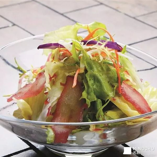 鲜红草莓片缀在脆嫩鲜蔬间,