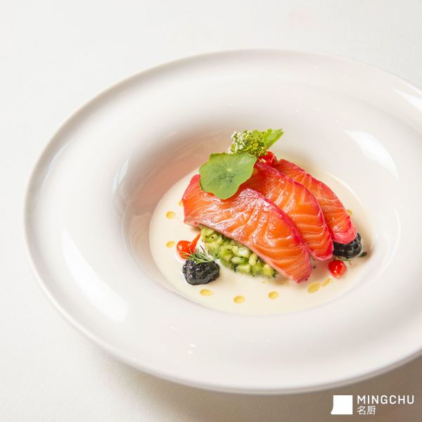 ·选用经典的甜菜根腌渍三文鱼,肉质呈现通透的橙红渐变,边缘带自然粉晕,既保留了鱼肉的柔嫩,又增添了清香味,减少了三文鱼油脂的厚重感。·青瓜莎莎做脆爽基底,搭配蛤蜊酱汁提升鲜味和平衡鱼肉的油脂感,带来清爽的奶香与酸度。·黑莓提供酸甜果香与深色视觉对比,水滴辣椒提升酸甜口感并能提亮色彩,莳萝与旱金莲叶则带来草本香气与可食用花卉的精致感
